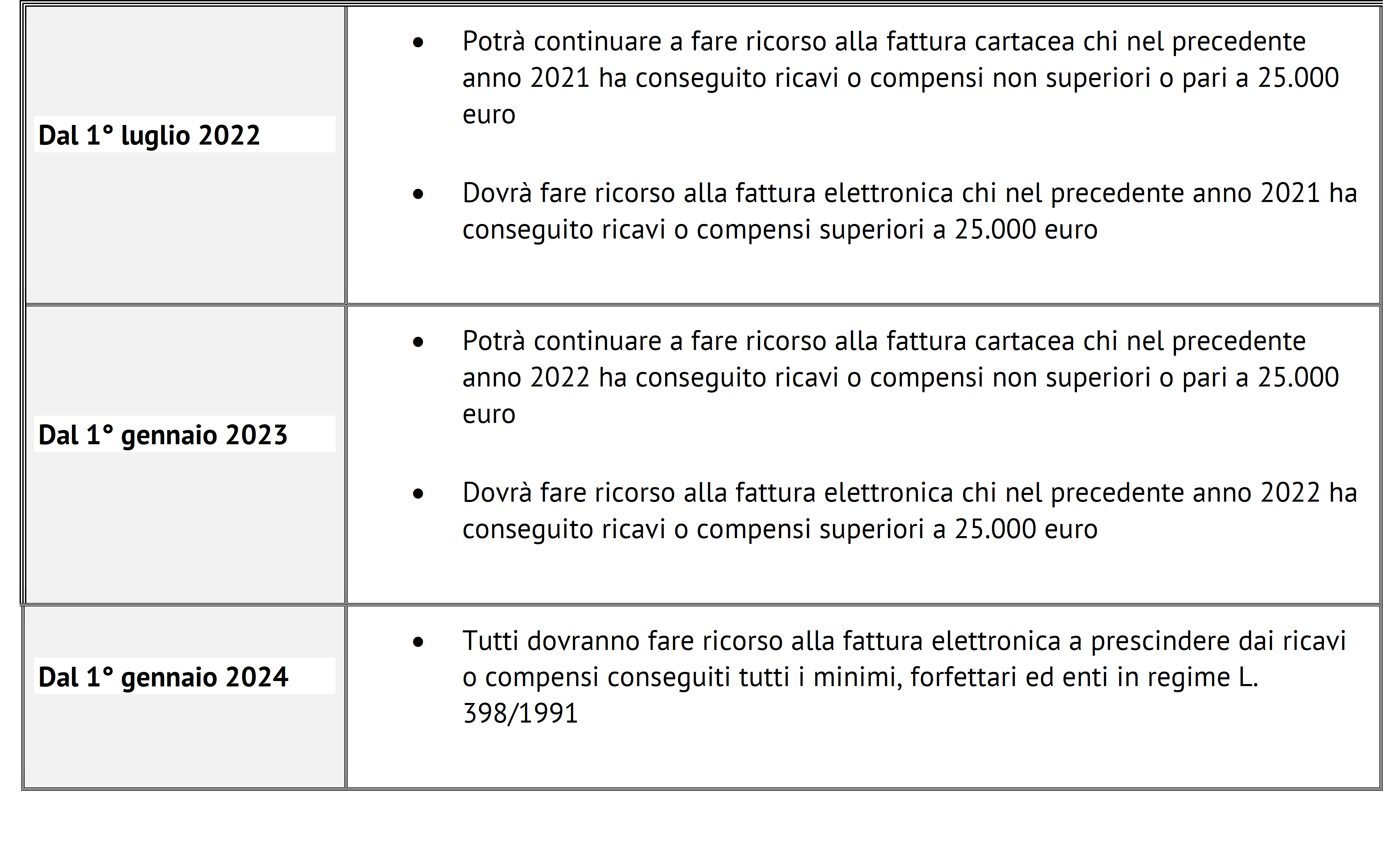 • a partire dal prossimo 1° luglio 2022 l’obbligo di fatturazione elettronica riguarderà “i soggetti che nell’anno precedente abbiano conseguito ricavi ovvero percepito compensi, ragguagliati ad anno, superiori a 25.000 euro”;